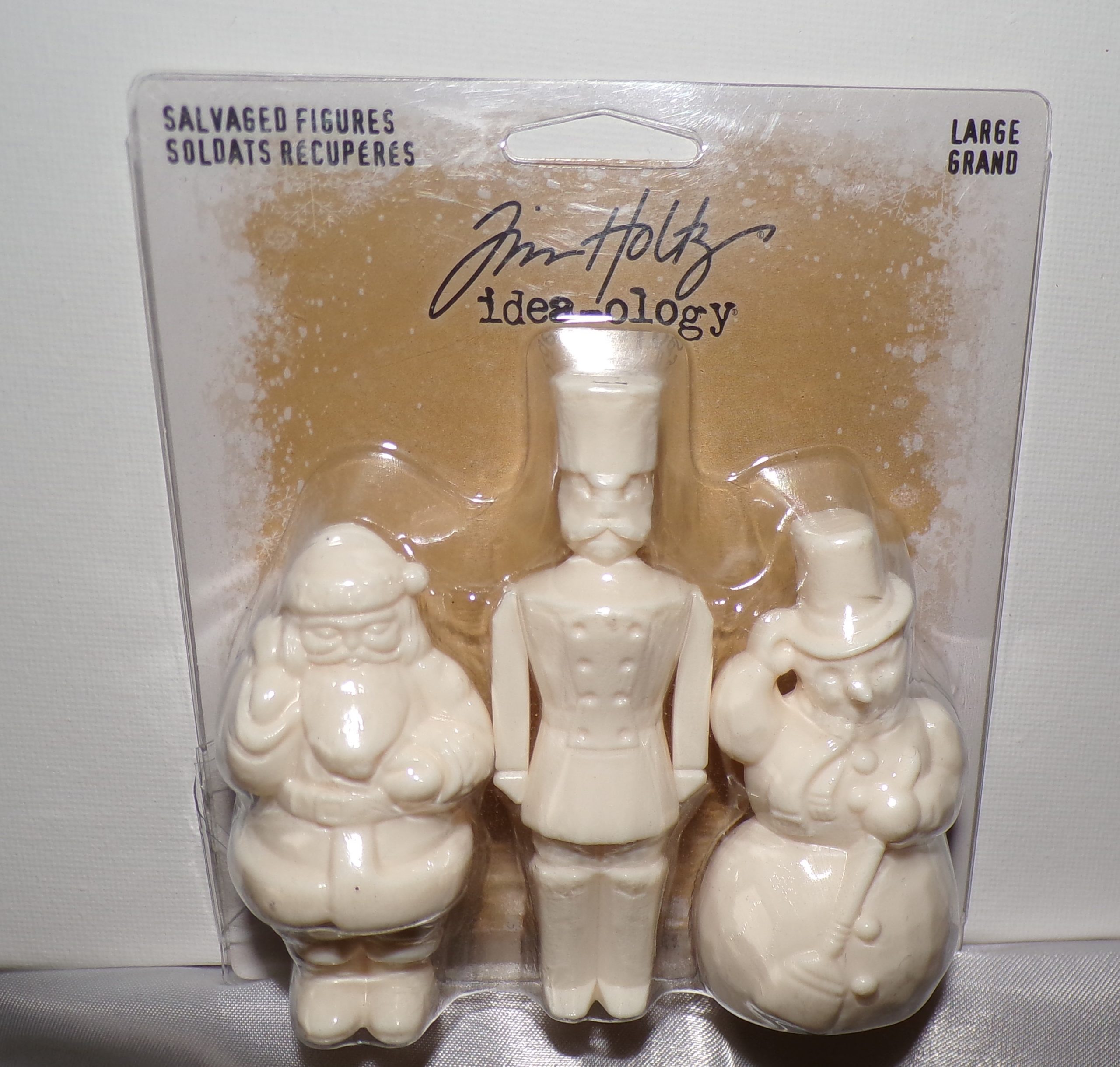 Capture the magic of the holiday season with Tim Holtz Large Salvaged Figures. These three whimsical characters – a toy soldier, snowman, and Santa – are miniature works of art just waiting to be brought to life. Crafted from Tim’s signature vintage style, each 3-inch figure features intricate details and charming imperfections that give them a timeworn, salvaged look. Their neutral off-white coloring is the perfect blank canvas to let your creativity run wild. Bring out their hidden personalities by aging them with inks and paints to achieve a truly distinctive distressed finish. Includes 3 pieces constructed of acrylic resin plastic. Santa measures 2-3/4″ in height, Toy Soldier measures 3-1/2″ in height, Snowman measures 2-3/4″ in height
